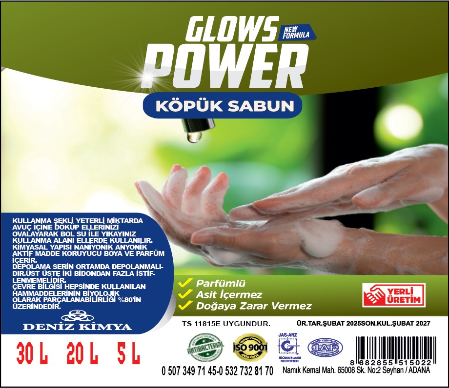 Glows Power Köpük Sabun, özel formülü sayesinde köpük sabun dispenserlerinde kullanıma uygundur. Ellerde yoğun hijyen sağlarken cildi kurutmaz, yumuşaklık verir. Konsantre yapısı sayesinde ekonomiktir ve uzun süre kullanım imkânı sunar. Farklı esans seçenekleriyle temizlik sırasında ferahlık ve hoş bir koku bırakır. Günlük kullanıma uygundur.